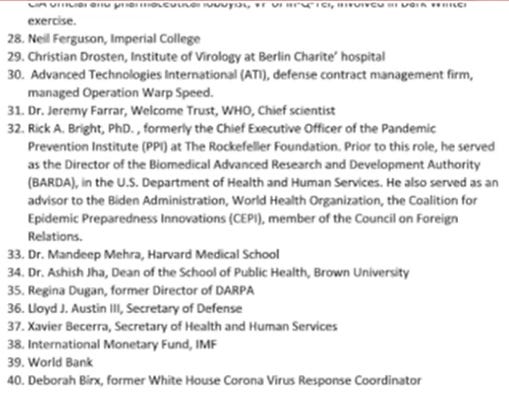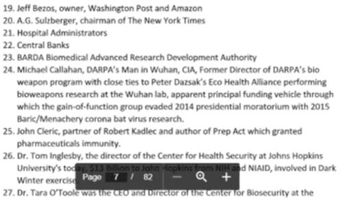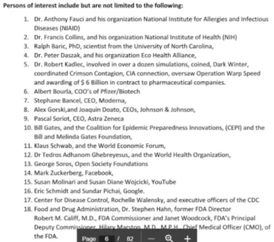 GRAND JURIES. Dr. Breggin said the current genocidal conspiracy is not particularly new, as similar trends have occurred many times since the beginning of civilization, especially in empires. Reiner said prosecutors are likely to come out against the conspiracy eventually. Joseph talked about the Ban the Jab movement and Dr. Francis Boyle's explanation that the injections meet the definition of bioweapons. His Substack is at https://josephsansone.substack.com/archive. Ana asked David to explain how Grand Juries can get the ball rolling to prosecute the conspirators. David mentioned sources of much of the evidence for Grand Juries. He said their plan is to inform all of the prosecutors in the U.S. of the evidence of the Covid scam. He showed the following list of Persons of Interest for Grand Juries to question.